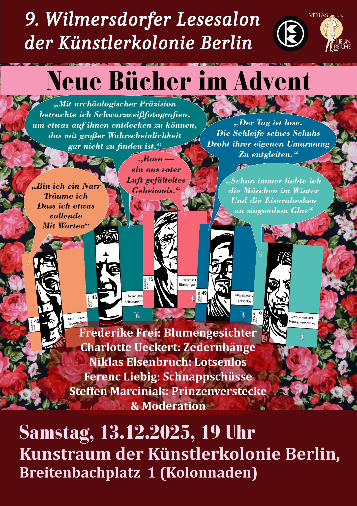 August 2023: Als 16. Band der Lyrik-Edition NEUN, hrsg. von Steffen Marciniak und Patrick Hattenberg, erschien Blumengesichter, mit Linolschnitten von Steffen Büchner. Verlag der 9 Reiche, Berlin, ISBN 978-3-948999-16-2. Mein zweiter Band mit Blumengedichten nach Echt Himmel das Blau heute von 2009. 32 Seiten, 125x190 mm, Fadenheftung, illustrierte, nummerierte und signierte Ausgabe. |